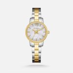 تتميز الساعة بسوار معدني ثنائي اللون، حيث يجمع بين الفولاذ الفضي اللامع والذهب اللامع في تناغم مثالي، مما يعكس الذوق الرفيع والشخصية المميزة لمرتديها. كما أن المينا البيضاء الأنيقة، المزودة بعقارب ومؤشرات ذهبية، تضفي لمسة من الفخامة والوضوح في قراءة الوقت.